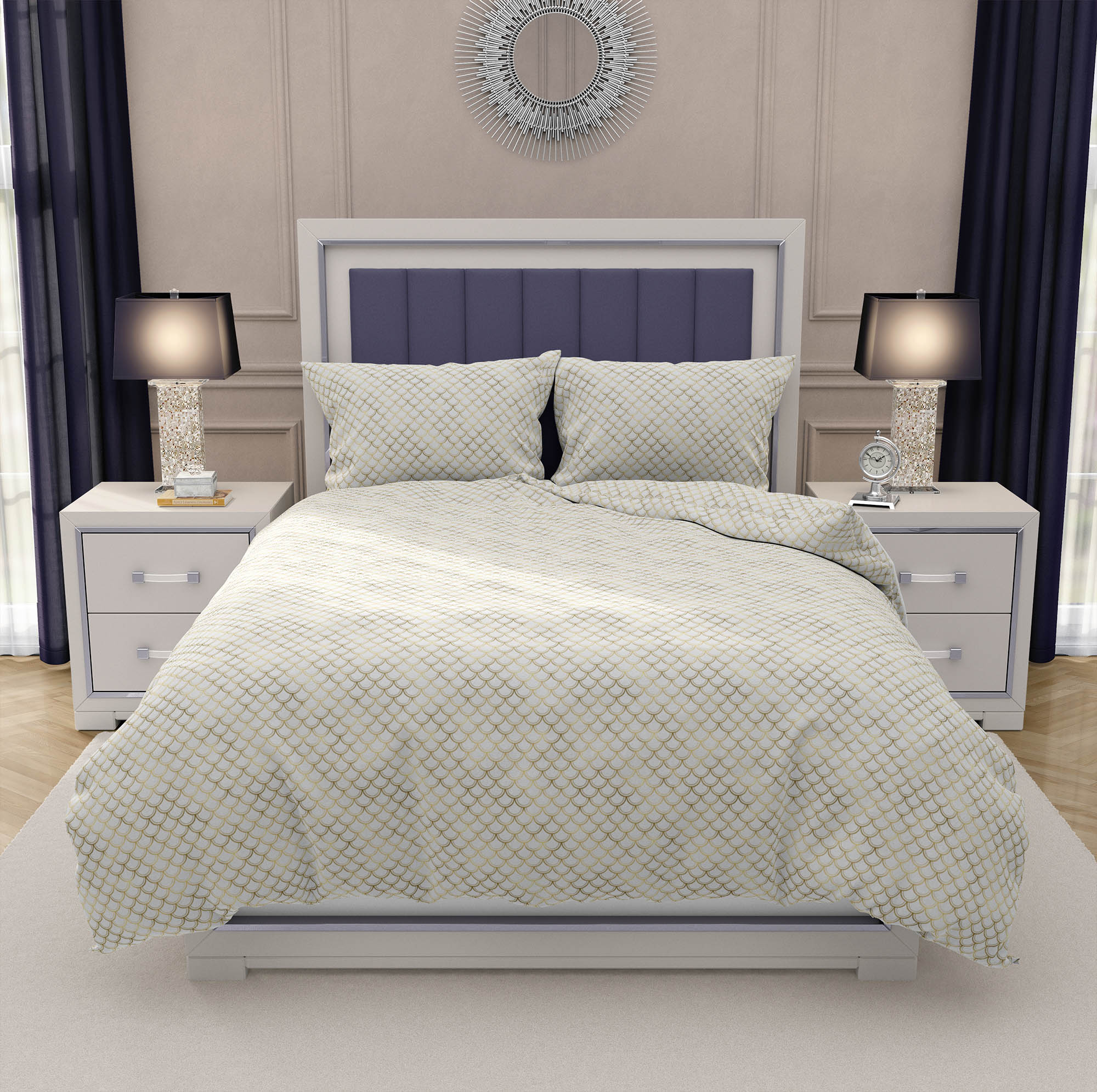 Die dargestellte Visualisierung ist eine illustrative Grafik und zeigt einen Deckenbezug in der Größe 155x200 cm und einen Kissenbezug in der Größe 50x70 cm. Aufgrund der unterschiedlichen Monitoreinstellungen können die auf den Fotos gezeigten Farben leicht von der Farbe des fertigen Produkts abweichen. Die Sättigung des jeweiligen Drucks kann je nach Art des Stoffes, auf den er aufgetragen wird, unterschiedlich sein. Auf dickeren Stoffen ist die Sättigung geringer.
